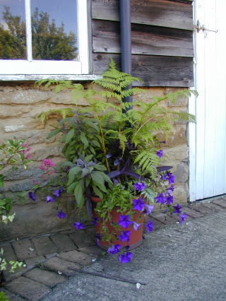 | 工房の前の展示場兼即売所兼フロント・ガーデン 植栽とコンテナーのコンビネーションがすばらしい! |